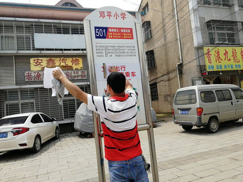 公司在公园广场绿地、公交站牌、501、502路公交车、出租车等处设立文明行为提示牌,张贴“创文”宣传标语,为300余个不锈钢垃圾箱印制了"创文"宣传贴画,在城区主干道打造环卫示范路,永久性树立公示牌。在提高市民对创建全国文明城市知晓率的同时,随时随地提醒市民支持和参与到鄂州"创文"的行动中来。