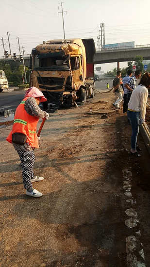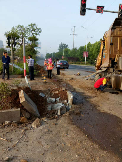 5月25日清晨,创业大道与高新大道交汇处因交通事故造成大面积公用设施损毁和环境卫生破坏,新市民公司第一时间发现并调集市政、绿化、环卫等部门赶往现场处置。市政、绿化部门工作人员现场查验人行道设施、绿化带植被损失情况,并制定修复方案落实修复措施。环卫部门出动保洁人员10余名连续作战2小时,清理现场渣土、玻璃碎渣及泄露机油面积约200平方米,保障了道路畅通。